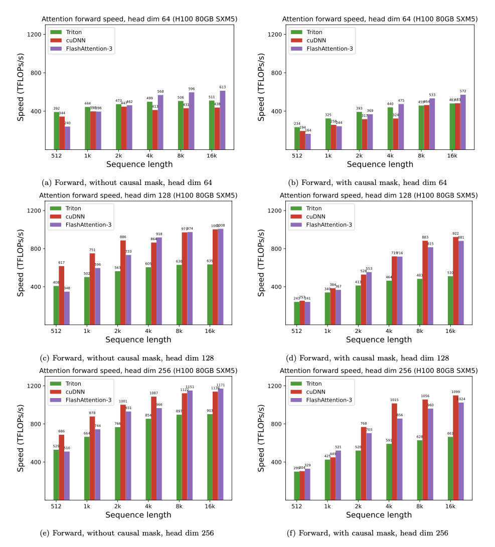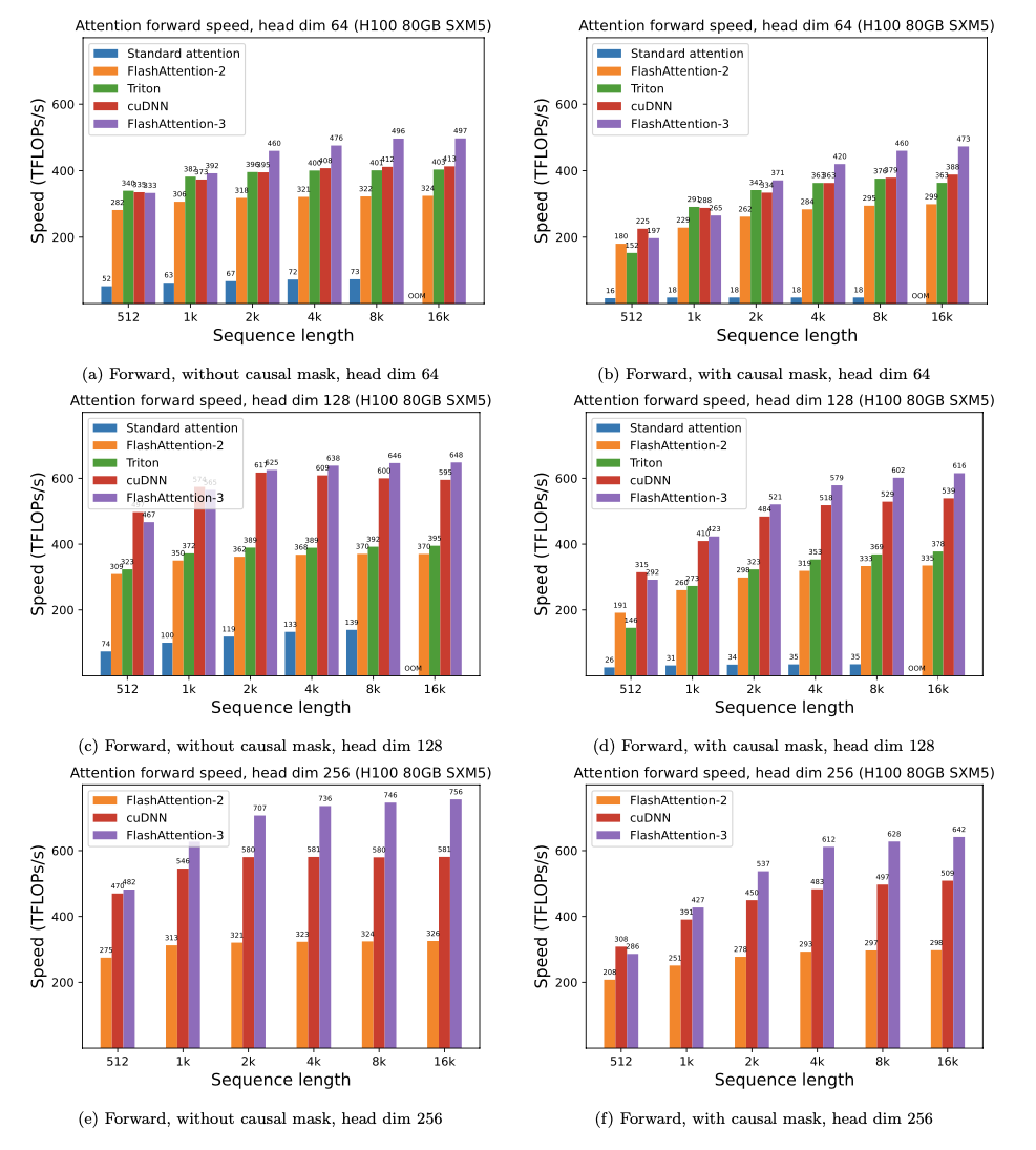 We’re excited to release FlashAttention-3 that incorporates these techniques. It’s 1.5-2.0x faster than FlashAttention-2 with FP16, up to 740 TFLOPS, i.e., 75% utilization of H100 theoretical max FLOPS. With FP8, FlashAttention-3 reaches close to 1.2 PFLOPS, with 2.6x smaller error than baseline FP8 attention.