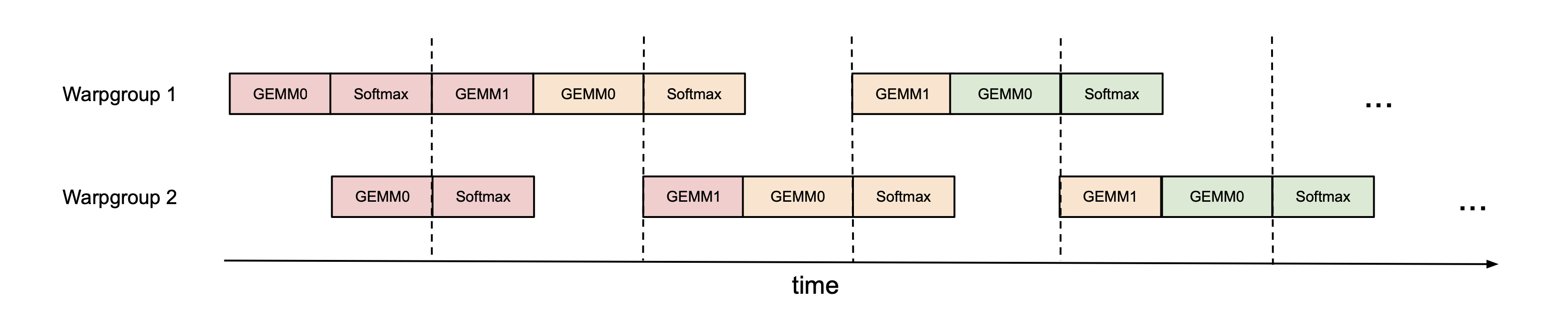 Even within one warpgroup, we can have some part of softmax running while the GEMMs of that warpgroup is running. This is illustrated in this figure, where the same color denotes the same iteration.