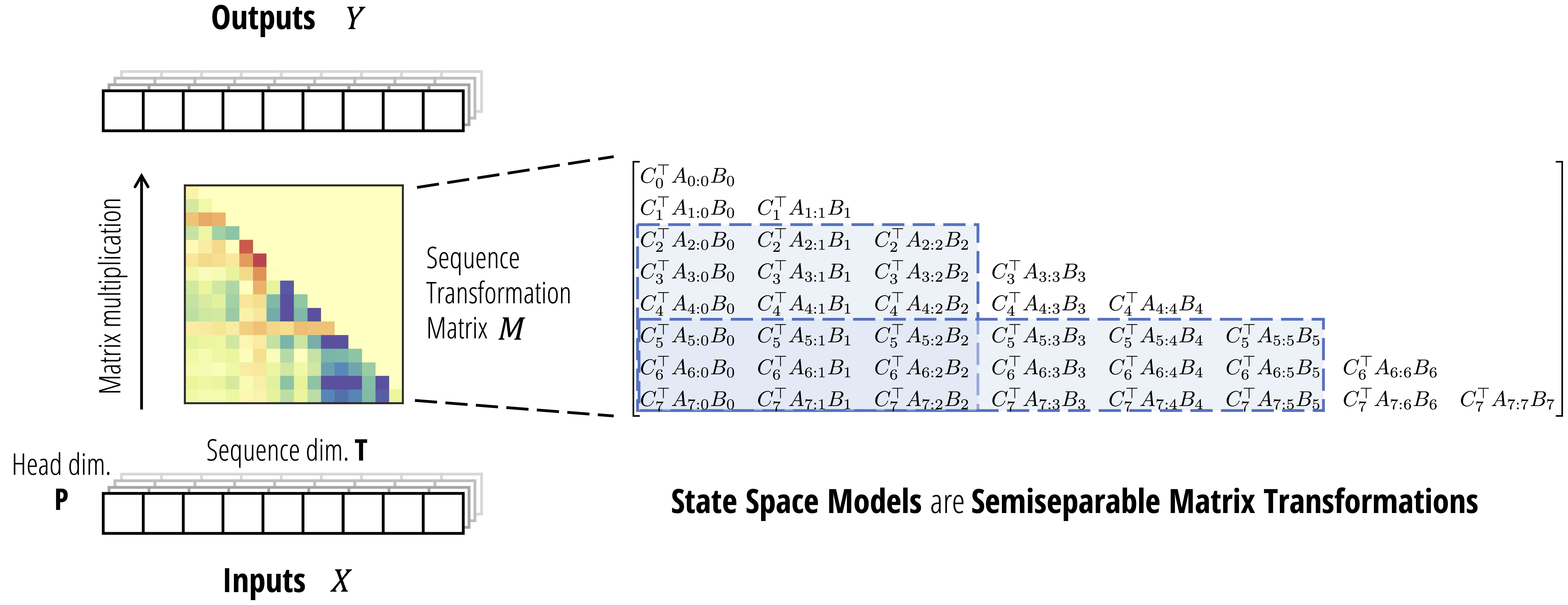 \[Y = \mathsf{SSM}(A, B, C)(X) = MX\]where $M_{ij} = 0$ for $i < j$ (i.e. it’s lower triangular) and otherwise \begin{equation} \label{eq:semiseparable} M_{ij} = C_i^\top A_{i:j}^\times B_j := C_i^\top A_i \dots A_{j+1} B_j \end{equation}